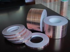 双导铜箔;基材:铜箔,传导压克力胶,粘性好,附着力强。性能:具有保温,隔热,防水,粘力佳,耐寒性好,易撕,可消除电磁干扰(EMI),隔离电磁波对人体的危害,避免电压或电流影响功能,主要用于电脑显示器电脑周边线材与变压器制造中央空调管线,抽烟机,冰箱,热水器等的管线接缝,精密电子产品、电脑设备、电线、电缆等;高频传输时,隔离电磁波干扰,耐高温防止自燃,规格:(0.018mm-0.095mm)各种厚度,宽度可任意分切。