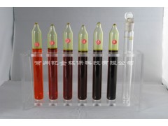 应用举例: 某镀铬液测得的铬浓度为222.5g/l,查下表可知需取镀铬液8.9ml,比色后发现其颜色介于2号和3号之间,则这时2号管的三价铬浓度为2.225g/L,3号管4.450g/L,则该镀铬的三价铬浓度值就为2.225与4.450之间的某一个值,据此可判断确定三价铬Cr3+的浓度。