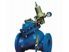 工作原理: 当管道从进水端给水时,水流过针阀进入主阀控制室,出口压力通过导管作用到导阀上,当出口压力高于导阀设定值时,导阀关闭,控制室停止排水,此时主阀控制室内压力升高并关闭主阀,出口压力不再升高。当出口压力降到导阀设定压力时导阀开启,控制室向下游排水。由于导阀的排水量大于针阀的进水量,主阀控制室压力下降,进口压力使主阀开启。稳定状态下,控制室进水、排水相同,开度不变,出口压力不变。调节导阀弹簧即可设定出口压力。
