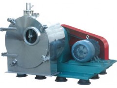 悬浮液从进料管进入螺旋内腔,并通过螺旋小头接近锥端底部的喷料口进入转鼓,在离心力场作用下料浆中的液相通过设置在转壁上的筛网被分离出去,固相颗粒则被截留在转鼓内;同时,转鼓内的固相颗粒在离心力和螺旋与转鼓之间的差速作用下从转鼓小端向转鼓大端运动,在此运动过程中,由于回转直径的加大,离心力得到快速递增,固相从初始进入时的高含湿量固相到排出转鼓时达到低含湿量固相,从而实现固液相自动、连续的分离。