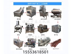 做牛肉干需要那些设备呢?小编现在就跟大家简单介绍一下做牛肉干需要的设备,解冻槽(假如咱们是鲜肉的话,就不需要这个设备了)→盐水注射机→切条切片机→真空腌制机→烘干机机(或者烟熏炉都可以)→真空包装机→高温杀菌锅→风干机→打包入库。(同样这些设备也可以做猪肉干、马肉干、羊肉干等等各种肉干制作)