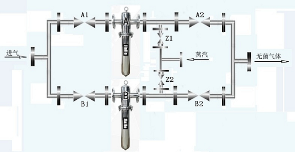 一备一用使用方法A过滤器使用①.打开A1 A2阀门,②.关闭B1 B2 Z1 Z2阀门,使用3天后A过滤器需要蒸汽灭菌时切换至B过滤器使用①.打开B1 B2,②.关闭A1 A2,③.打开Z1(蒸汽阀门) ④20-30分钟后关闭Z1,同样方式切换AB过滤器 交替使用,如有大情疫真空泵超负荷运行可以同时使用A B二台过滤器①.打开A1 A2 B1 B2阀门,②.关闭Z1 Z2阀门