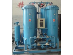 PSA(pressure swing adsotption)技术方法应用中小型氮气制造设备。工作原理:根据变压吸附原理,采用高品质碳分子筛作为吸附剂。在一定压力下由于动力学效应,氧在碳分子筛孔中的扩散速率远大于氮,在吸附未达到平衡时,氧被碳分子筛大量吸附,氮分子在气相中被富集,达到氧氮分离。由于碳分子筛对氧的吸附容量随压力的不同两者有明显差异,降低压力,既可解吸碳分子筛吸附的氧分子,使碳分子筛再生,得以重复循环使用。本公司产品采用双塔结构,一个塔在吸附产氮,一塔解吸再生,通过PLC智能程序控制器控制气动角座阀的启闭,使两塔循环交替,连续产出氮气。