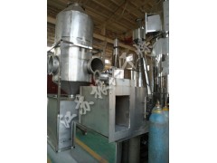 热空气经过特殊设计的分配器进入干燥机底部,滤饼状、膏状物料由螺旋加料器送入干燥器,下落过程中在高速旋转的搅拌器和热空气的共同作用下,迅速分散为流态化而得以干燥,成为粒状或粉末状,在随热气流旋转上升的过程中,较大颗粒、水分高的物料受离心力作用被甩向器壁,经分级器截留落回底部,再次被分散、干燥;粒度适宜、水分合格的物料由分级器排出,由旋风分离器和布袋收集器收集为成品。