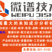 上海微谱化工技术服务有限公司(简称“微谱技术”),是中国最大的未知成分分析机构,掌握顶尖的微观谱图分析技术,拥有国内最强大的微观谱图数据库,自有仪器齐全,微谱实验室已获CMA国家计量认证。多年来,微谱技术始终专注于未知成分分析领域,已成长为该领域无可争议的领导者。 微谱技术的业务范围几乎覆盖所有化工材料行业,在众多领域积累了成功的技术服务经验:塑料、橡胶、橡塑用助剂、胶粘剂、涂料、油墨、工业清洗剂、民用清洗剂、金属表面处理剂、金属加工液、水处理助剂、建筑类添加剂、油田助剂、皮革助剂、纺织印染助剂、脱模剂、助焊剂、润版液、选矿药剂等几十个品类。截止2012年6月,微谱技术已经累计为包括世界500强企业在内的9000多家企业提供相关分析技术服务,平均每2天就有微谱客户借助微谱技术服务研发出新产品上市。 微谱分析服务可应用于化工材料类产品开发或改进、质量控制或工业诊断、以及了解成分。一款产品在研发前、研发中、生产中、质控中遇到的所有成分问题都可以在微谱找到解决方案,从常规分析到特需分析,从异物分析到失效诊断,从... [详细介绍] 暂无记录
