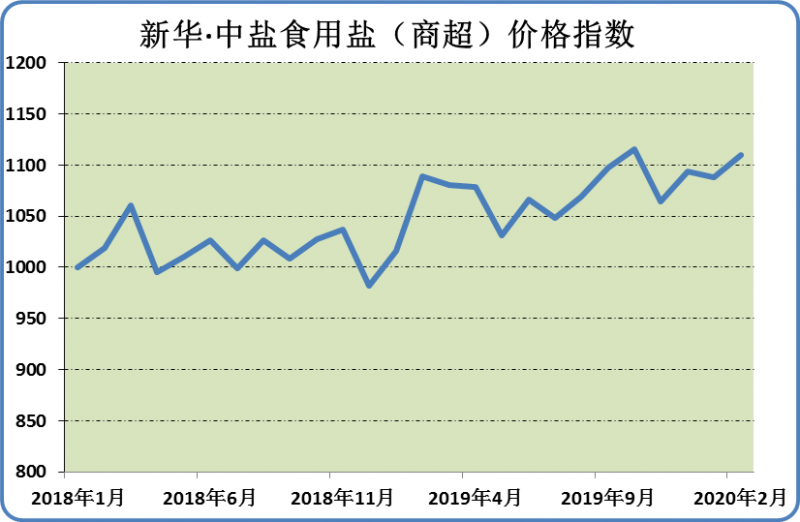 本期新华·中盐食用盐(商超)价格指数小幅上涨。数据显示,截至3月9日,指数报1110.04点,较上期上涨22.53点,涨幅2.07%。