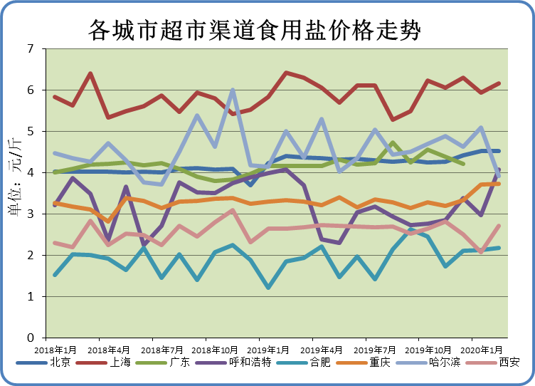 总体来看,2月份食用盐价格整体保持稳定运行态势。分城市来看,上海、呼和浩特、合肥、重庆、西安超市销售食用盐均价较上月上涨,北京超市销售食用盐均价较上月持平,哈尔滨超市销售食用盐均价较上月下跌。
