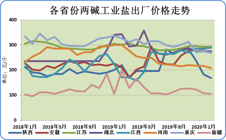分区域来看,2月份安徽、江苏、江西两碱工业盐出厂均价较前一月上涨,其中安徽2月份两碱工业盐出厂价格为293.34元/吨,较前一月上涨9.93元/吨,涨幅3.5%,涨幅居各省首位。陕西、河南、重庆、新疆两碱工业盐出厂均价较前一月下跌。其中陕西跌幅最大,陕西2月份两碱工业盐出厂价格为168.12元/吨,较前一月下跌14.73元/吨,跌幅为8.06%。