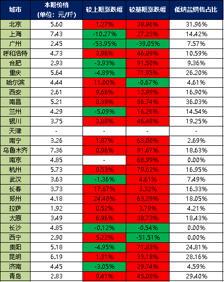 分价格区间来看,本期超市食用盐销售单价在5元/斤以上的城市有8个,分别是北京、上海、重庆、南昌、乌鲁木齐、杭州、贵阳、昆明;超市食用盐销售单价在4-5元/斤之间的城市有7个,分别是呼和浩特、哈尔滨、兰州、南京、郑州、长沙、济南;超市食用盐销售单价在3-4元/斤之间的城市有5个,分别是银川、南宁、武汉、长春、太原;超市食用盐销售单价在3元/斤以下的城市有6个,分别是广州、合肥、西安、拉萨、西宁、青岛。