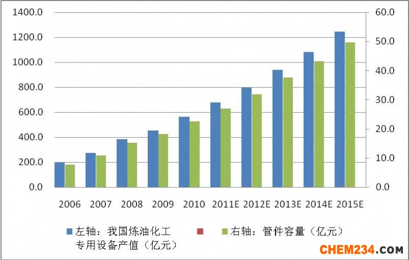 从产能上看,我国“十二五”期间的炼油能力增长,将小于“十一五”期间的幅度,但由于炼油工业中加氢等装置的增加,我国的炼油行业更加重视提升炼化装备的技术含量上,宁可加大装备的一次投入力度,也要争取在项目建设完成后达到更优的经济效益和社会效益。我国十一五期间,炼油化工专用装备年产值的复合增长率为30%,预计未来五年我国炼油化工专用装备年产值的增长速度可能有所放慢,但整体仍保持平稳增长,2015年有望达到1244亿元[2]。一般情况下,管件购置费占到炼油化工设备采购额4%左右,未来几年的石化装备年产值和预计的市场容量见下图: