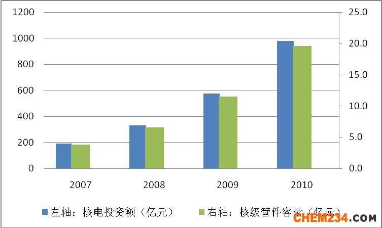 近年我国核电基本建设投资加快,2010年我国核电基本建设投资达979.7亿元,年均增长速度超过70%,其中,管件购置费一般占核电建设项目总投资的2%左右,根据近年核电基本建设投资总额可以估算出近年核级管件市场容量。如下图所示: