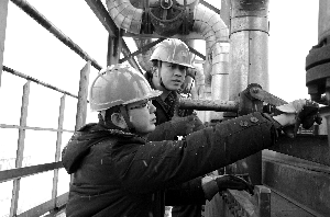 中化化工网讯 11月26日,吉林地区再次出现强降雪。,强化防冻管理,加大监控力度,尤其针对重点设备、保温伴热设备及管线进行特别“关照”,实行连续巡检、特保特护,确保工作到位、人员到位、措施到位,为冬季装置安全稳定运行提供了保障。图为该公司炼油厂延迟焦化车间员工正冒雪检查装置空冷器运行情况。 (何天林 摄)