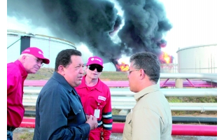 (中华化工网讯)当地时间8月25日,委内瑞拉法尔孔州阿穆艾炼油厂发生大规模爆炸并引发火灾,导致至少41人死亡,超过80人受伤。该炼油厂是委内瑞拉最大的炼油厂,每天能加工原油64.5万桶。图为26日,委内瑞拉总统查韦斯(前排左)到现场视察,要求就爆炸原因展开深入调查,并采取相应行动。 (CFP 供图)
