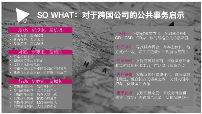 三位演讲嘉宾从议题专家、行业实践者和专业服务者的不同视角出发,深入浅出地勾画了碳中和的政策图景与行业趋势,剖析了外企所面临的现实挑战与潜在机会,并就企业如何通过强化政府关系与公共关系借力碳中和给出了独到的见解。