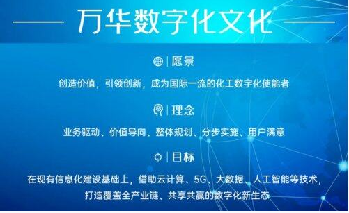 通过“智慧万华2025”战略 引领及落地执行,用5年时间,实现标准化向智能化转变,将万华化学建设成为以智能制造、全球一体化管控、生态圈高效协作为主要特征的世界一流数字化企业,形成万华化学专属数字化竞争优势,打造安全、高效、体验友好的数字智慧万华。