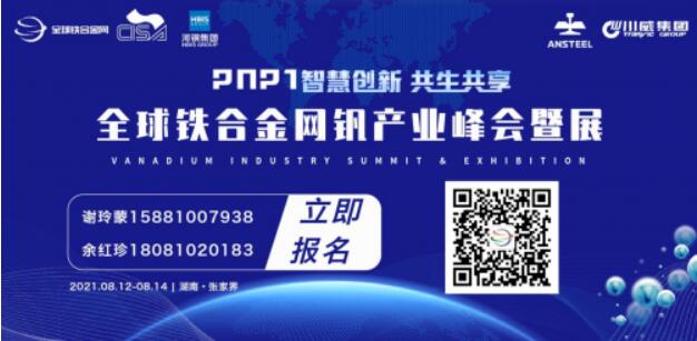 由全球铁合金网主办,中国钢铁工业协会、攀钢集团成都钒钛资源发展有限公司、攀钢集团研究院有限公司、河钢承德钒钛新材料有限公司、川威集团成渝钒钛科技有限公司鼎力支持的「2021钒产业峰会暨展」将于2021年8月12日-14日在湖南张家界举行。