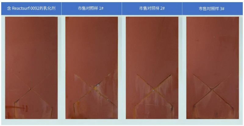 图:在冷轧钢板上进行500小时盐雾试验(ASTM B-117)后,含索尔维Reactsurf®0092和高颜料体积浓度(PVC)的环氧乳胶漆,相比其它各种对照样,具有更好的耐腐蚀性。图片:索尔维