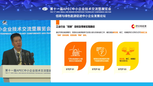 思安控股董事长邢玉民发布题为《大型工业企业零碳解决方案研究--中小企业能源技术创新与实践》主题演讲,为在场的各位领导嘉宾详细介绍了大型工业企业“双碳目标”解决方案,他表示:能源供给侧可再生能源替代和能源需求侧抓节能提效是“双碳目标”实现的两个关键路径。工业作为能源需求侧的用能大户,占比超过60%,是节能提效的主体。单一的技术手段已经不能充分满足深度节能、脱碳的需要,需要从传统技术节能向创新性、系统性节能转变。实现技术升级、手段升级、模式升级,将成为未来节能潜力的主要来源,并推广覆盖到所有工业体系。发挥智慧综合能源服务的优势,通过多维协同、跨界融合,以一体化能源解决破解行业壁垒,在保证用户可靠用能的前提下,实现多能源协同、多环节协同以及工艺、能源预数字系统,同步实现能源利用清洁、高效、经济最优化的目标。
