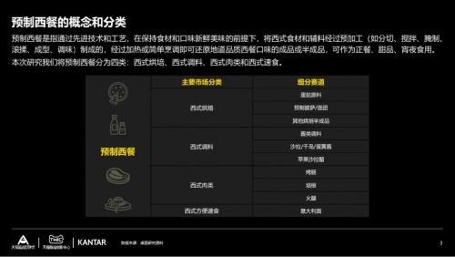 预制西餐是将西式食材和辅料进行预加工,经过加热或简单烹调即可食用的西餐成品或半成品,主要包括西式烘培、西式调料、西式肉类和西式速食等几大类目。