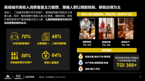 预制西餐的主力客群为高线城市高收入消费者,青壮年女性用户居多,精致妈妈、新锐白领、资深中产是品牌的重点发力人群,儿童预制西餐或许也能成为打动消费者的切入点。