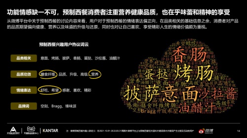 在面向用户进行沟通时,食品的功能性和情感缺一不可。从微博平台中关于预制西餐的讨论内容来看,用户对于预制西餐的情绪表达偏正向,在品类相关的基础信息之余,消费者对产品的品质期望偏向健康、营养以及味道的升级与还原,同时也对让自己喜欢、享受精彩人生的情绪价值颇为重视。可以看出,消费者既注重食材品质,也青睐味蕾和精神的双重享受。