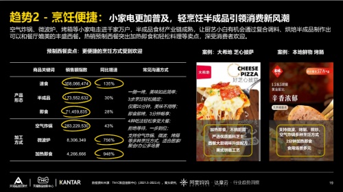 趋势2、烹饪便捷。更快、更轻,厨房小白0门槛也能做大厨。根据阿里妈妈达摩云行业趋势洞察提供的行业数据,速食产品的同比增速高达135%。在加工方式中,支持空气炸锅、微波炉、加热即食的商品,其销售额都呈现出爆发式的增长态势,用户可以充分利用厨房中的小家具,料理预制西餐的半成品,制作出媲美餐厅的丰富西餐。