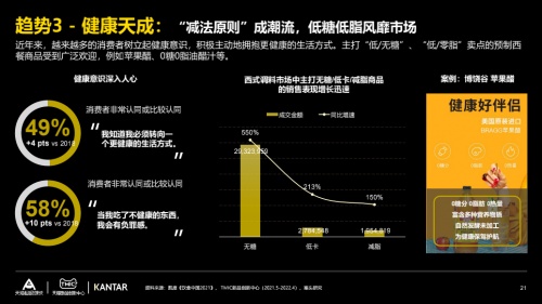 趋势3、健康天成。拥抱更健康的生活方式,以“减肥原则”研制食品,更天然的食材,更少的添加剂,以低糖、0糖、低脂等要素亲近注重健康的消费者。
