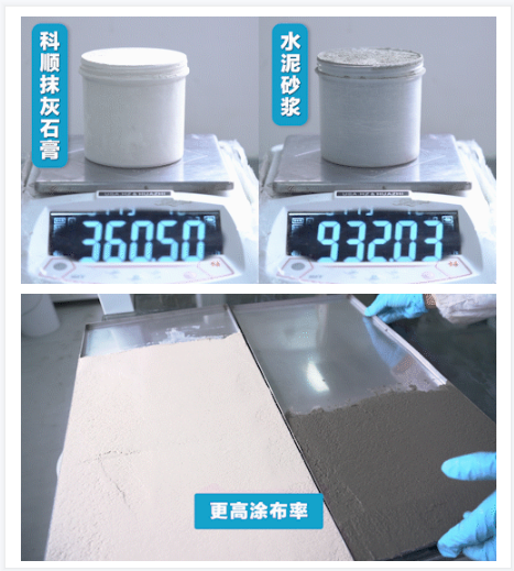 轻质抹灰石膏材料密度很低 相同单位的材料下 轻质抹灰石膏的重量约为水泥砂浆的1/3 涂布率却是水泥砂浆的5倍 10万平米的施工面积 水泥砂浆需要用3000吨 而轻质抹灰石膏仅需800-1000吨