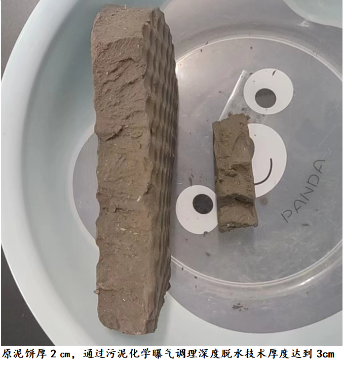汩罗市国祯水处理有限公司污水处理量达到5万立方每天,由于污泥脱水设备只有2台250平方米的压滤机,所用污泥调理剂使得压滤机每天进泥量只有80多立方米,未能及时处理水处理产生的污泥,由于排泥不及时,造成污泥曝气池浓度过高,达到7500mg/L,甚至10000mg/L以上,降低了污水处理效率,也降低了污泥活性,采用污泥调理剂HQ220替代聚氯化铝和聚丙烯酰胺,并使用化学曝气调理方法,压滤机进泥量达到120立方米,污泥每天处理量增加了33%以上,可有效降低曝气池的污泥浓度,提高污水生化处理效率,由于污泥能够及时处理,污泥活性好,污泥更易脱水。该技术不但适应于夏天的污泥调理,更重要的是,该技术在冬天温度较低时能克服化学药剂调理效果差,污泥脱水困难的问题。2020年,我国污泥处理量达到9000多万吨,十四五期间,污泥处理处置问题更加突出,本技术的突破对污泥处理处置行业具有非常重要的现实意义。