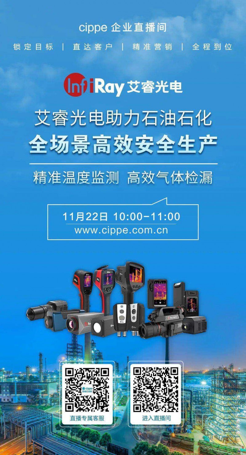 11月22日上午10:00-11:00,艾睿光电将亮相cippe企业直播间,并带来多款红外成像技术和产品推介,助力石油石化全场景高效安全生产,敬请关注!