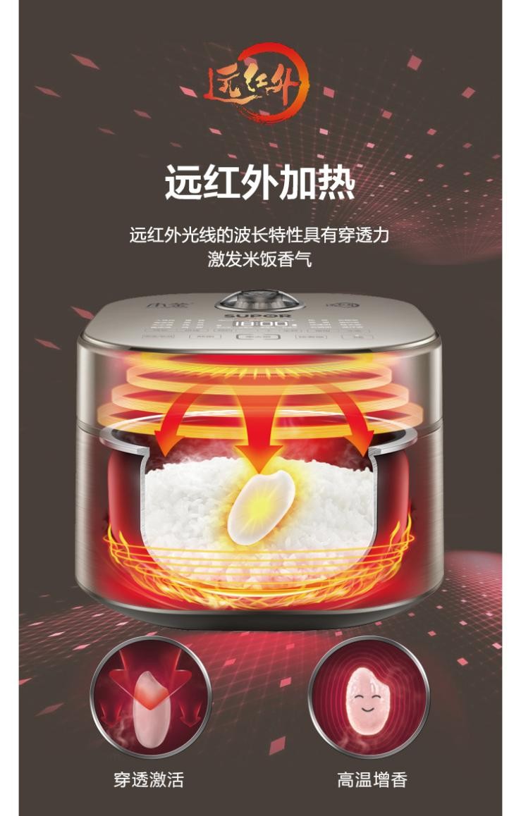 另外,远红外线穿透能力强,可以将米饭加热到103°,大米在高温环境下,可以增加糊化度,米饭就会更香甜。与此同时,远红外加热还具有穿透性,能让热量穿透水面,直接作用于米粒本身,由内而外激活米芯,让米饭更透芯,熟得更透彻,在带来香甜口感的同时,还更有利于消化吸收。