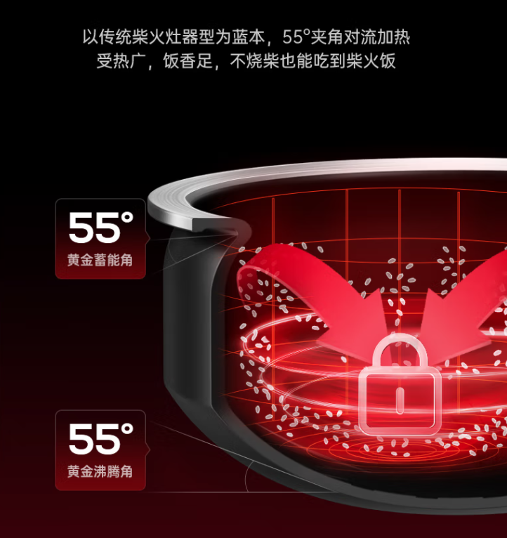 苏泊尔已经专注内胆技术20多年。苏泊尔远红外电饭煲在球釜的基础上再次升级,以中国传统大铁锅为蓝本,采用了第十代广口球底本釜内胆,更好地还原了柴火灶宽口浅底的器型。此外,这款电饭煲的内胆还设计了55°聚能角,形成蓄热“聚能环”从而锁住饭香。广口球体器型,使得其比普通电饭煲的平底器型受热面积更大,加热更为迅速,升级的55°黄金夹角与饭煲内部形成了空气蓄热腔,可以有效蓄热,锁住饭香,减少米饭水分蒸发;而普通的电饭煲采用的多为直角设计,会造成热量和香味的大量损失。大大的提升了消费者的使用幸福感。
