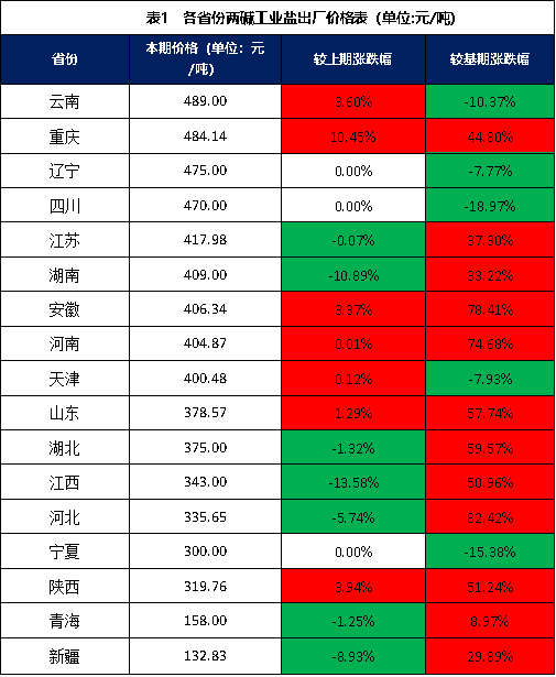 分价格区间来看,本期两碱工业盐单价在400-500元/吨之间的地区有9个,分别是云南、重庆、辽宁、四川、江苏、湖南、安徽、河南、天津;两碱工业盐单价在400元/吨以下的地区有8个,分别是山东、湖北、江西、河北、宁夏、陕西、青海、新疆。