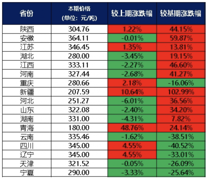 分价格区间来看,本期两碱工业盐单价在300元/吨及以上的地区有11个,是陕西、安徽、江苏、江西、河南、山东、湖南、云南、四川、辽宁、天津;两碱工业盐单价在300元/吨以下的地区有6个,分别是湖北、重庆、新疆、河北、青海、宁夏。