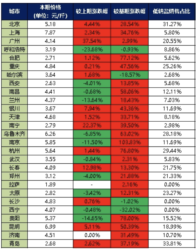 分价格区间来看,本期超市食用盐销售单价在5元/斤以上的城市有7个,分别是北京、上海、乌鲁木齐、南京、杭州、贵阳、昆明;超市食用盐销售单价在4-5元/斤之间的城市有9个,分别是广州、重庆、南昌、兰州、天津、长春、长沙、西宁、济南;超市食用盐销售单价在3-4元/斤之间的城市有5个,分别是呼和浩特、哈尔滨、银川、武汉、郑州;超市食用盐销售单价在3元/斤以下的城市有6个,分别是合肥、西安、南宁、拉萨、太原、青岛。