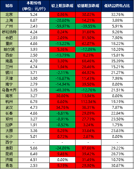 分价格区间来看,本期超市食用盐销售单价在5元/斤以上的城市有6个,分别是北京、上海、杭州、长沙、贵阳、昆明;超市食用盐销售单价在4-5元/斤之间的城市有7个,分别是呼和浩特、重庆、南昌、兰州、武汉、长春、济南;超市食用盐销售单价在3-4元/斤之间的城市有7个,分别是哈尔滨、银川、天津、乌鲁木齐、南京、郑州、太原;超市食用盐销售单价在3元/斤以下的城市有6个,分别是广州、合肥、西安、南宁、拉萨、青岛。