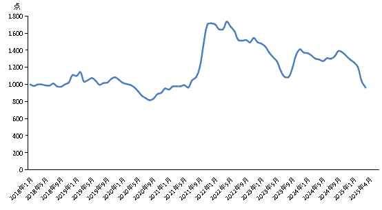 新华财经北京5月19日电(陆子琛、蒋正阳)2025年4月份,新华·中盐两碱工业盐价格指数报963.74点,较上期(2025年3月)下跌72.37点,跌幅6.98%;较基期(2018年1月)下跌36.26点,跌幅3.63%;较周期内最高点1736.66点(2022年4月)下跌772.92点,跌幅44.51%;较周期内最低点816.2点(2020年8月)上涨147.54点,涨幅18.08%。