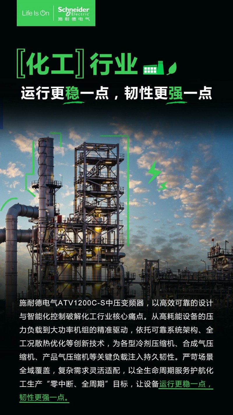 油气化工行业作为一个传统却又不断发展和创新的基础性行业,始终在大型装置运行上追求“安稳常满优”的极致目标,对相关配套工业设备的可靠性要求极为严格。随着产业升级改造的深入推进,电驱逐渐成为主流,如何应对电机启动时的扰动,如何在极端条件下保障系统“零中断”稳定运行,已成为化工企业面临的新痛点。在这方面,施耐德电气ATV1200C-S中压变频器凭借全要素的可靠性升级和全尺寸的优化设计,正在各大化工项目中发挥重要作用,为企业提供可靠性和灵活性的双重支撑。