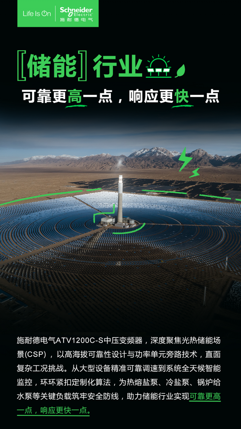光热储能作为新兴产业正迎来前所未有的发展机遇,光热储能项目如雨后春笋般涌现。由于行业特殊性,这些项目多位于光热资源丰富的荒原戈壁或高海拔地区,常年面临高低温、气候多变等复杂且严苛的环境挑战。这不仅要求现场设备具备过硬的可靠性,还需支持远程监控、状态监测等智能化运维功能,以提供多重保障。在这方面,施耐德电气ATV1200C-S中压变频器凭借其卓越的可靠性和智能化应用,正成为众多能源项目的“得力帮手”。