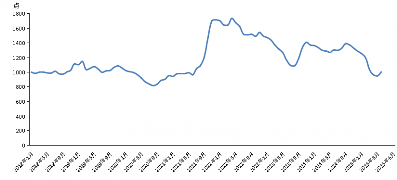 新华财经北京7月17日电(陆子琛、蒋正阳)2025年6月份,新华·中盐两碱工业盐价格指数报1002.84点,较上期(2025年5月)上涨55.06点,涨幅5.81%;较基期(2018年1月)上涨2.84点,涨幅0.28%;较周期内最高点1736.66点(2022年4月)下跌733.82点,跌幅42.25%;较周期内最低点816.2点(2020年8月)上涨186.64点,涨幅22.87%。