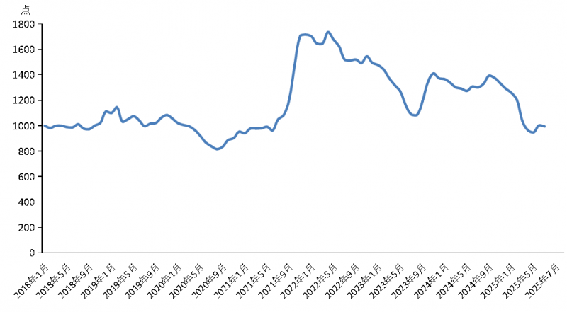 新华财经北京8月18日电(陆子琛、蒋正阳)2025年7月份,新华·中盐两碱工业盐价格指数报994.31点,较上期(2025年6月)下跌8.53点,跌幅0.85%;较基期(2018年1月)下跌5.69点,跌幅0.57%;较周期内最高点1736.66点(2022年4月)下跌742.35点,跌幅42.75%;较周期内最低点816.2点(2020年8月)上涨178.11点,涨幅21.82%。