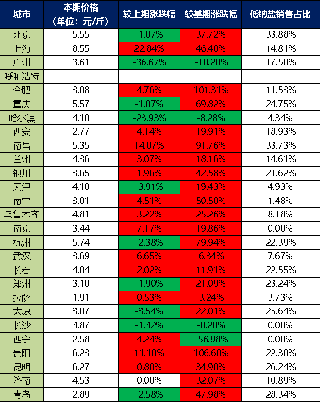 分价格区间来看,本期超市食用盐销售单价在5元/斤以上的城市有7个,分别是北京、上海、重庆、南昌、杭州、贵阳、昆明;超市食用盐销售单价在4-5元/斤之间的城市有7个,分别是哈尔滨、兰州、天津、乌鲁木齐、长春、长沙、济南;超市食用盐销售单价在3-4元/斤之间的城市有8个,分别是广州、合肥、银川、南宁、南京、武汉、郑州、太原;超市食用盐销售单价在3元/斤以下的城市有4个,分别是西安、拉萨、西宁、青岛。