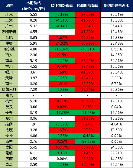 分价格区间来看,本期超市食用盐销售单价在5元/斤以上的城市有9个,分别是北京、上海、广州、重庆、南昌、乌鲁木齐、杭州、贵阳、昆明;超市食用盐销售单价在4-5元/斤之间的城市有5个,分别是呼和浩特、哈尔滨、兰州、长沙、济南;超市食用盐销售单价在3-4元/斤之间的城市有8个,分别是合肥、银川、天津、南宁、武汉、长春、郑州、太原;超市食用盐销售单价在3元/斤以下的城市有4个,分别是西安、拉萨、西宁、青岛。