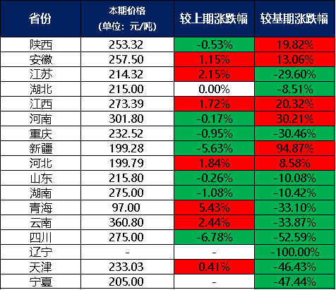 分价格区间来看,本期两碱工业盐单价在300元/吨及以上的地区有2个,分别是河南、云南;两碱工业盐单价在300元/吨以下的地区有14个,分别是陕西、安徽、江苏、湖北、江西、重庆、新疆、河北、山东、湖南、青海、四川、天津、宁夏。