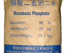 磷酸二氢钠(Sodium Dihydrogen Phosphate),无色斜方晶结晶,略有吸湿性。易溶于水,在一定的ph值下,由碳酸钠与磷酸反应或由磷酸氢二钠与一定比例的磷酸反应制得在湿空气中易结块。密封保存。酸碱度调节药。用于锅炉水处理,电镀、制革、焙粉、燃料助剂、洗涤剂、云母彻合、酸性缓剂等,也是制取六偏磷酸钠和缩聚酸盐的原料。