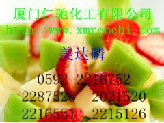 美达磷用于各种食品中的功能如下:   一、金属离子封锁作用 各种食品中含有微量金属离子,在食品加工操作时具有干扰性造成食品品质的降低。美达磷能和金属离子(如钙、镁、铁)形成可溶性复合物,因而避免金属离子产生沉淀现象。 此外,由于天然水中含有矿物质成分,对于加工的食品有不良的影响,食品加工的水应添加美达磷,使水产生软化作用,达到改善制品品质的效果。   二、缓动作用 在食品加工或保藏食品时,由于美达磷对酸性和碱性具有缓动作用,可以保持食品中所需要的适当PH值。   三、增加保水性 美达磷可以和动物性及植物性蛋白质发生作用,以促进水合作用,增加保水性,这个重要功能可用以防止肉类、家禽类及鱼类解冻时产生的离水现象。   四、增加结着力 美达磷可以增加肉类制品的易溶性蛋白的溶出,以生成稳定的蛋白质外膜而包住肉品乳化液中的脂肪球,防止其合并现象,在加热时这些蛋白质形成一网状骨架,产生坚固且易切割的典型香肠制品。   五、食品包藏作用 美达磷有防止或延缓水状食品系中不饱和脂质氧化的作用,并可在食品表面形成一层抗菌膜,以抑制食品腐败菌的生长,可延长储存时间,保持食品新鲜度。   六、改善食品风味 添加美达磷可以使食品保持原来的特性,并有增强柔软度,改善风味,保存颜色等诸多效用。   制作水晶钵仔糕专用原料:美达磷作用:晶莹透明、口感爽、不沾牙