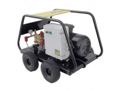 超高压冷水清洗机,工作压力350公斤,水流量每分钟15升,采用三陶瓷柱塞曲轴泵,低速电机,机身紧凑四脚轮装配移动轻便,对应船用440V电源,用于船上清洗作业。