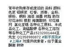 回收各种库存废旧积压的化工原料、颜料类;永固、太青、耐晒、大红粉、立索尔、中铬、色淀、永固、色原、橡胶大红、氧化铬绿、三氧化二铅、红丹、黄丹、金粉、银粉、珠光粉、七彩粉、钛白粉、立德粉、R-930、氧化铁红、黄、等系列、色浆类、藏青、青连、红连、化工助剂类、聚乙二醇、乙二醇、辛醇、丙酮、苯酐、顺丁烯二酸酐、季戊四醇、丙烯酰胺、红钒钾、红钒钠、高锰酸钾、苯酚、酚醛树脂、双酚A、水杨酸、富马酸、五氯酚、甘氨酸、油酸、己二酸、硫脲、环氧树脂、石油树脂、松香改性树脂、聚酰胺树脂、650树脂、T31固化剂、氧化物、氯化物、硫酸物、漂白水、硼酸、硼砂、磷酸一铵、磷酸二铵、六偏磷酸钠、三聚磷酸钠、亚硝酸钠、焦磷酸钠、焦磷酸钾、焦亚硫酸钠、三氯化铁、防染盐S、乌洛托品、硫脲、柠檬酸、酒石酸、酒石酸钾钠、氯化钾、保险粉、氢氧化钾、纳、片碱、双氧水、消毒杀菌类产品、污水处理原料、AES、磺酸、工业盐酸、硫酸、大、小苏打、元明粉、硬脂酸、石蜡、氯化石蜡、{无锡化工回收}各种硅油,氨基硅油,冰醋酸,异丙醇、乳化剂、OP-10、天那水、白电油、乙酯、丁酯、甲醇、乙醇、{苏州化工回收}吡啶、二氯甲烷、三氯甲烷、三乙醇胺、二乙醇胺、乙醇胺、桐油、{上海油漆回收}DMF三氯乙烯、、{吴江化工回收}乙酸、导热油、溶剂、废溶剂、烧火油等、色浆、试剂、有机、无机、分析试剂、{杭州颜料回收}化学试剂、橡胶塑料、铝银浆、各类色母粒、氯化聚乙烯CPE、SBS、{回收}UV-9、UV531、{收购库存}抗氧剂、聚乙烯PE、聚丙烯PP、{广州色粉回收}等各种品牌电镀化工助剂、{回收}硫酸镍、硫酸铜、硫酸亚锡、氯化镍、氯化锌、氧化锌、氯化亚锡、氯化铜、氧化铜、氧化锌、锡酸钠、氰化亚铜、铬酸酐、草酸、等!!!手机15232001444