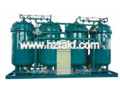 PSA制氧机是根据变压吸附原理,采用高品质的沸石分子筛作为吸附剂,在一定的压力下,从空气中制取氧气。经过纯化干燥的压缩空气,在吸附器中进行加压吸附、减压脱附。由于空气动力学效应,氮在沸石分子筛微孔中扩散速率远大于氧,氮被沸石分子筛优先吸附,氧在气相中被富集起来,形成成品氧气。然后经减压至常压,吸附剂脱附所吸附的氮气等杂质,实现再生。一般在系统中设置两个吸附塔,一塔吸附产氧,另一塔脱附再生,通过PLC程序控制器控制气动阀的启闭,使两塔交替循环,以实现连续生产高品质氧气之目的。