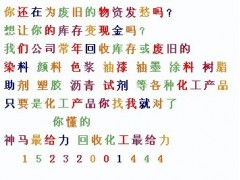 回收各种库存废旧积压的化工原料、颜料类;永固、太青、耐晒、大红粉、立索尔、中铬、色淀、永固、色原、橡胶大红、氧化铬绿、三氧化二铅、红丹、黄丹、金粉、银粉、珠光粉、七彩粉、钛白粉、立德粉、R-930、氧化铁红、黄、等系列、色浆类、藏青、青连、红连、化工助剂类、聚乙二醇、乙二醇、辛醇、丙酮、苯酐、顺丁烯二酸酐、季戊四醇、丙烯酰胺、红钒钾、红钒钠、高锰酸钾、苯酚、酚醛树脂、双酚A、水杨酸、富马酸、五氯酚、甘氨酸、油酸、己二酸、硫脲、环氧树脂、石油树脂、松香改性树脂、聚酰胺树脂、650树脂、T31固化剂、氧化物、氯化物、硫酸物、漂白水、硼酸、硼砂、磷酸一铵、磷酸二铵、六偏磷酸钠、三聚磷酸钠、亚硝酸钠、焦磷酸钠、焦磷酸钾、焦亚硫酸钠、三氯化铁、防染盐S、乌洛托品、硫脲、柠檬酸、酒石酸、酒石酸钾钠、氯化钾、保险粉、氢氧化钾、纳、片碱、双氧水、消毒杀菌类产品、污水处理原料、AES、磺酸、工业盐酸、硫酸、大、小苏打、元明粉、硬脂酸、石蜡、氯化石蜡、各种硅油,氨基硅油,冰醋酸,异丙醇、乳化剂、OP-10、天那水、白电油、   有机颜料:      无机颜料: